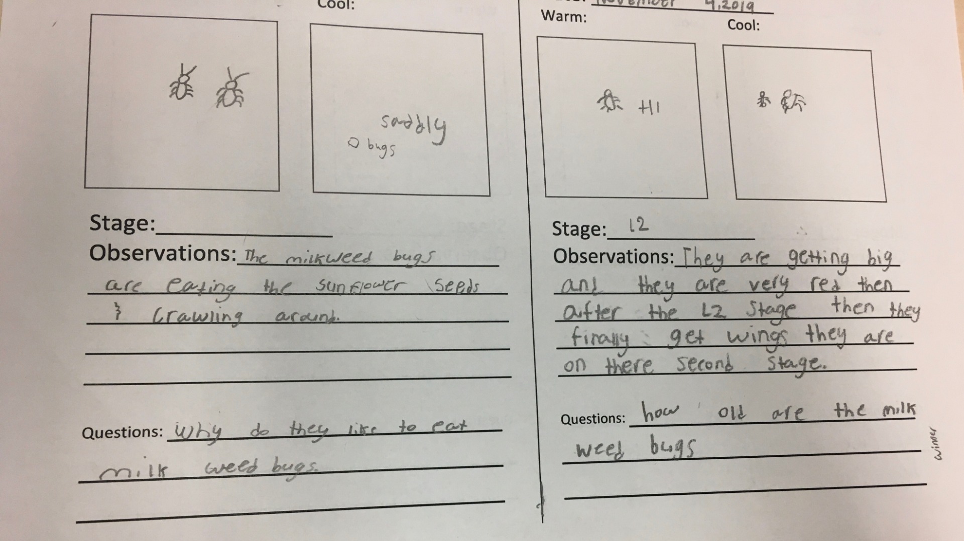 1. Show students the nymph stages of the Milkweed Bug. Have them talk to a partner about what they observe changes as the insects grows. Ask for responses.